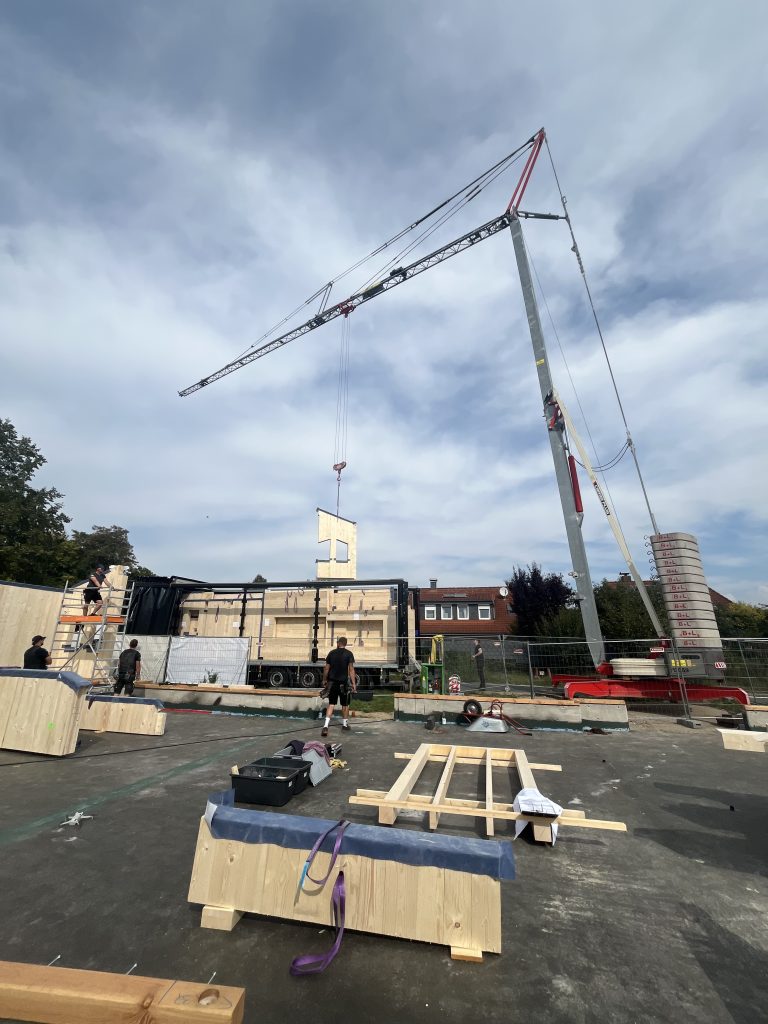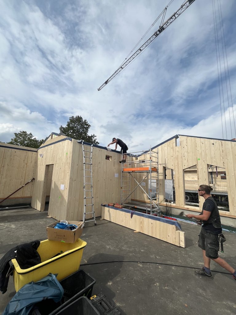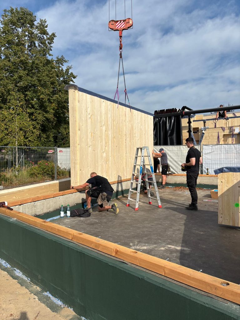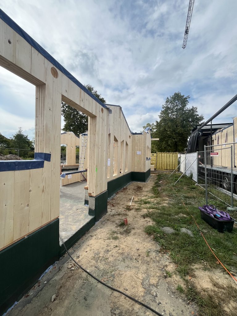 Gestern ging es los unser neues Krippenhaus nimmt immer mehr Gestalt an. Stück für Stück wurden die Wände montiert. Am Ende von Tag eins stand bereits der erste Schlafraum.